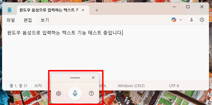 단축키 win + H를 눌러 음성입력을 열어 말하면 메모장에 글자로 자동 입력됩니다.